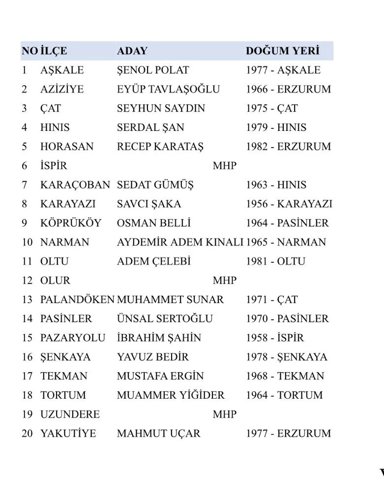 3 Şubat Cumartesi günü (yarın) AK Parti Genel Başkanvekili Efkan Ala tarafından açıklanacak olan merkez ve ilçe belediye başkanları belirlendi. Merkez ilçelerde Aziziye Belediyesi'nde Muhammed Cevdet Orhan yeniden aday gösterilmezken, Çat, Pasinler, Şenkaya, Oltu ve belediye başkanlarıyla da yola devam edilmeyerek, yeni isimler belirlendi. Aşkale ve Narman belediye başkanları da yeniden aday olmamıştı.