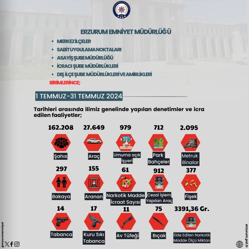 1-31 Temmuz 2024 tarihleri arasında Erzurum Emniyet Müdürlüğü’ne bağlı birimlerce yürütülen denetim ve faaliyetler kapsamında; 162 bin 208 şahısa yönelik GBT uygulaması yapıldı. 27 bin 649 araç denetlendi, 912 araca cezai işlem uygulandı. Umuma açık 979 iş yeri denetlendi. Park ve bahçelerde 712, metruk binalarda 2 bin 95 denetim gerçekleştirildi. 297 kişi bakayadan ve aranan 155 şahıs yakalanarak adli makamlara teslim edildi. 61 narkotik madde operasyonunda 3391,36 gram narkotik madde ele geçirildi. 17’ü kurusıkı, 14 tabanca, 11 av tüfeği, 377 fişek ve 75 bıçak ele geçirildi.