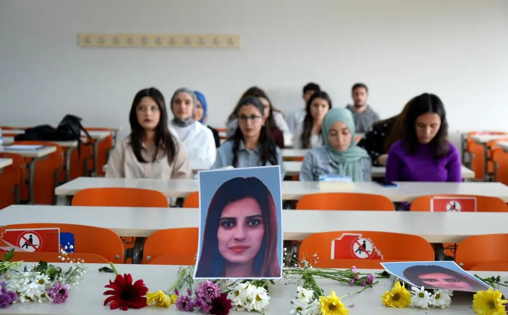 Erzurum'da düğün hazırlıkları yaptığı eşi Ali Osman Buzlak (21) tarafından boğulan Hatice Agcakale Buzlak'ın (24), öğrenim gördüğü Erzincan Binali Yıldırım Üniversitesinde (EBYÜ) yas hakim oldu. Öğrenci arkadaşları Hatice'nin sırasına çiçekler bırakarak kadına şiddete tepki gösterdiler.