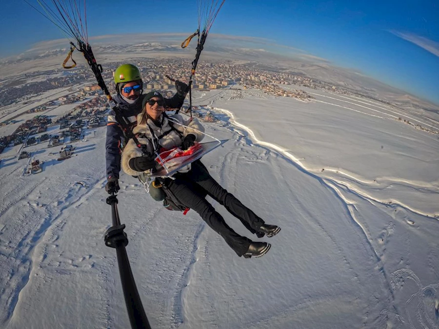 Palandöken'in 3100 rakımlı zirvesinde yamaç paraşütü ile süzülen Neşe Durdi ve Yusuf Okuyucu, Erzurum'un coğrafi işaretli yemeği olan cağ kebabını tadını çıkardılar.