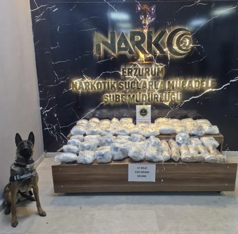 Erzurum Emniyet Müdürlüğü Narkotik Suçlarla Mücadele Şube Müdürlüğü ekiplerince Narkotik Madde Arama Köpeği Hera ile yapılan kontroller neticesinde; 37 kilo 150 gram skunk maddesi ve 19 bin 500 TL para ele geçirildi. Konuyla ilgili yakalanarak adli mercilere sevk edilen şahıs tutuklanarak Ceza İnfaz Kurumuna teslim edildi.