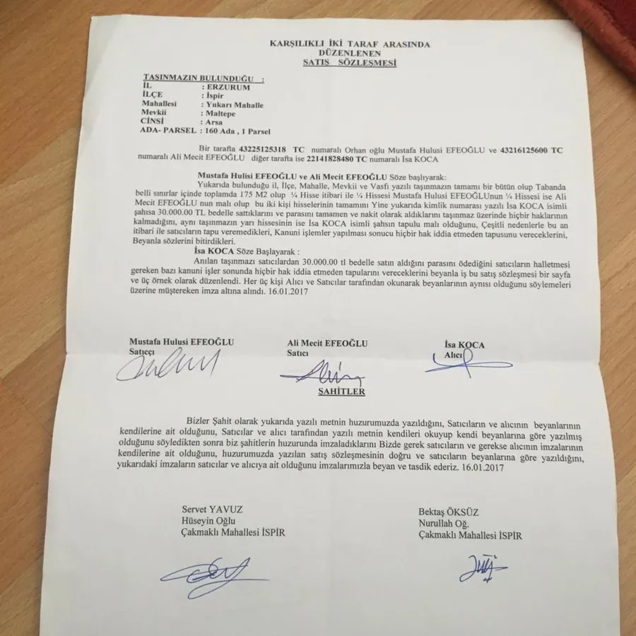 "Yazık günah değil mi bize ya? Şimdi arsam var yatmaya korkuyorum. Acaba yıkılır mı diye. Psikolojim bozuldu ya. Artık Kusuruma dur deyin ya. Çarşıda belli olan bir alanı yetmiş metre boyunda on metre eninde altı metre derinliğinde Kazan İşbir Belediyesi heyelanı körüklemiştir. Yazık günah değil mi ya? Burada kim yaptı İspir Belediyesi yaptı. Niye yaptı? Su şebekesini patlattı. Heyelana sebebiyettir. Su şebekesinin patlatmasının sebebi neydi? Ona oy veren gruba elektrik bağlatmasıydı. Kardeşim sen elektrikçi misin? TEDAŞ mısın? Sen belediye başkanlığına layık bir insanmışsın ki ben sana oy vereyim? Elektriği kime verdin? Yandaşlara mı verdin? Bana vermedin. İstemedim de istemem de. Çünkü o belediyenin kaynağında de yetim hakkı var. Gerçi İspir Belediyesi'ne yapılanlar çok değil. Çünkü yine elimde belgelerle yan tarafta bir ahır yapıldı. İspir Belediyesi'nin kamyonları, kepçeleri adeta seferber olundu. Biz ruhsatlı yaptık. Belediyenin hiçbir imkanını görmedik. Görmeye de iken yok. Fakat kaçak yapana belediyenin kamyonları, kepçeleri seferber oldu. Tabii bunun dibinde, yatanları da çok iyi biliyoruz. Ne yapalım? Al şu anda elinde her türlü belge mevcuttur. Buralar heyelanla olduğunu, heyelanları Elinde resmi belgeler olmasına rağmen bundan sonra olup biteni CİMER'e yazdım. Fakat Allah izin ederse tüm belgeleri Cumhurbaşkanımıza, Devlet Bahçeli ve göndereceğim. Fakat artık bizi bu zorluğun altından kurtarın. Allah aşkına."