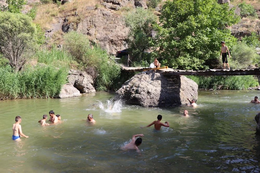 Hava sıcaklıklarının mevsim normallerinin üzerine çıktığı bugünlerde Lehsor Çayı, bölge halkı için adeta doğal bir plaj işlevi görüyor. Çayın serin sularına kendilerini bırakan vatandaşlar, su içinde türkü söyleyerek hem eğleniyor hem de serinliyor.