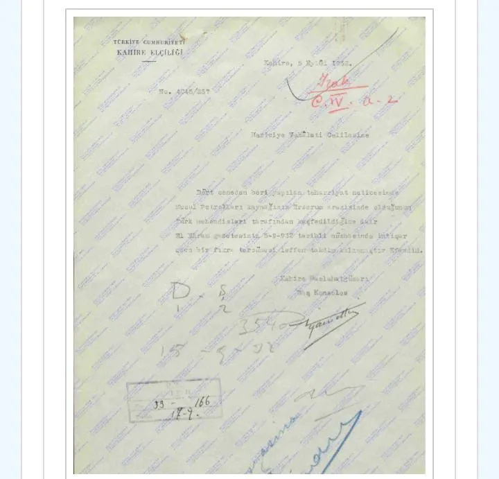 Söz konusu belge, Musul petrollerinin kaynağıyla ilgili uzun süredir tartışılan soruya ışık tutuyor ve Erzurum'un tarihî stratejik önemini yeniden gözler önüne seriyor. Belgeye göre, Musul petrollerini besleyen ana damarlar Erzurum topraklarından başlıyor ve o dönemde Türk mühendisler tarafından tespit edilmişti. Bu bilgi, 5 Eylül 1932 tarihinde Mısır'ın köklü gazetesi AlAhram tarafından yayımlandı. Gazetenin Yafa muhabirinin haberinde şu ifadeler yer aldı: "Türkler ve Musul Petrol Menbaı - Bu Kaynağı Türk Mühendisler Keşfetmiştir."